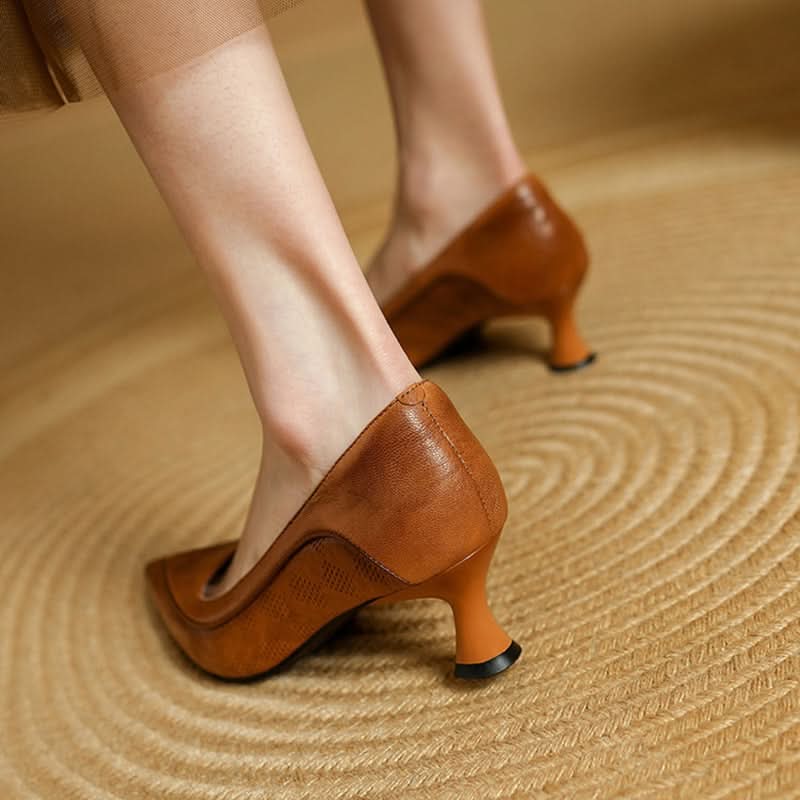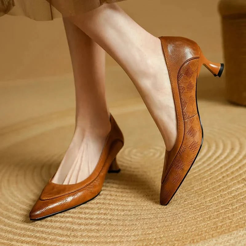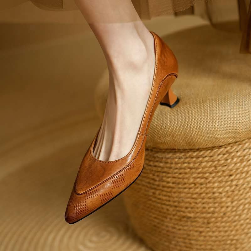 Pisa con elegancia con nuestras bombas de punta afilada hechas de cuero genuino. Su silueta curvada ofrece un aspecto sofisticado, mientras que la plantilla acolchada de espuma asegura comodidad durante todo el día. Con una altura de tacón kitten de 5cm-8cm, estas bombas son perfectas para cualquier ocasión.