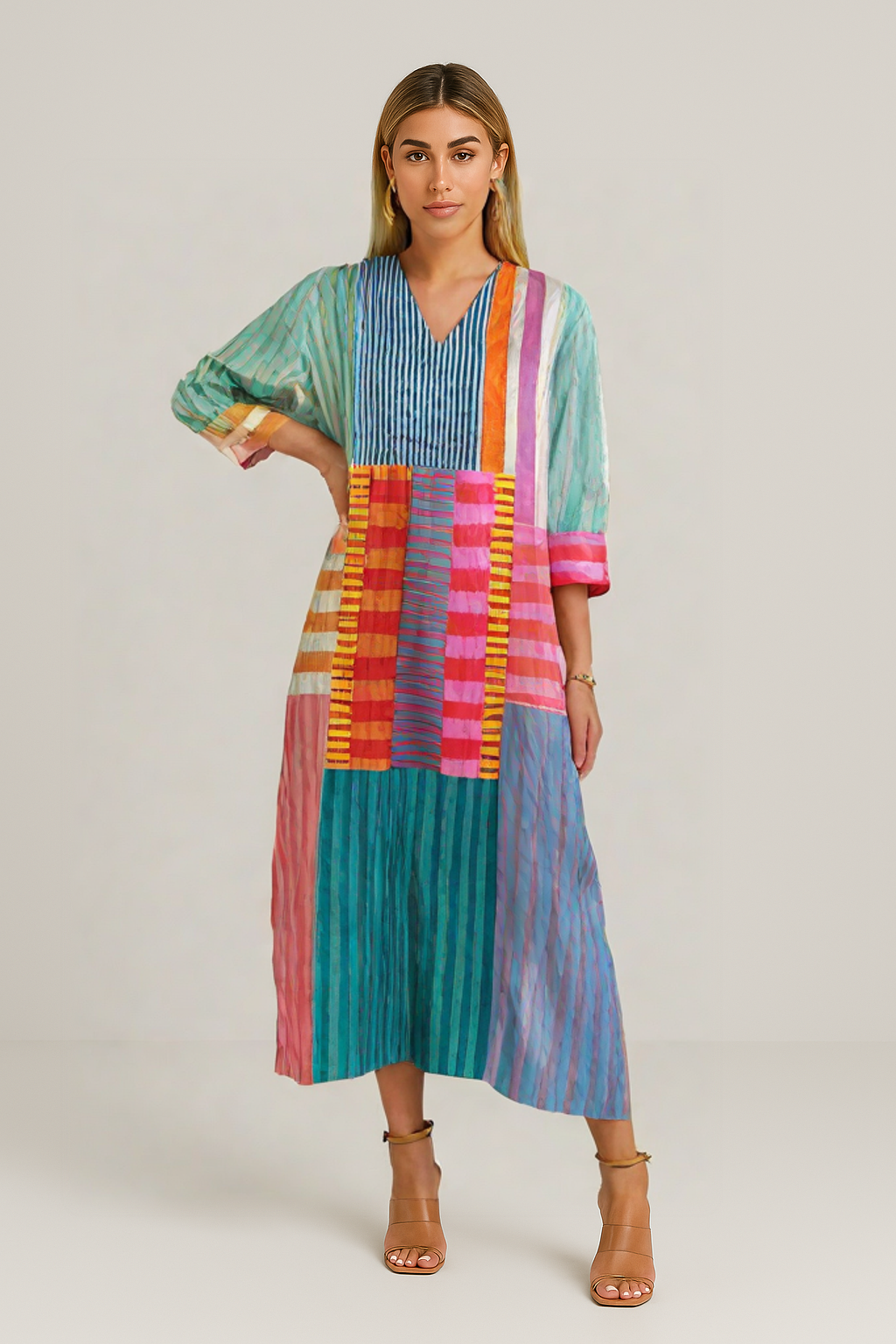 The MADITA dress is more than fashion – it is wearable art. Inspired by Dreamtime motifs, it combines geometric patterns with flattering elegance. The flowing cut complements every figure, while the breathable fabric guarantees comfort. Whether for exhibition openings, summer parties, or special dinners: MADITA gives you a unique style with depth.