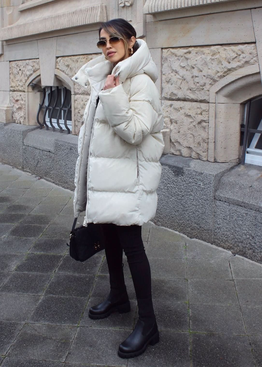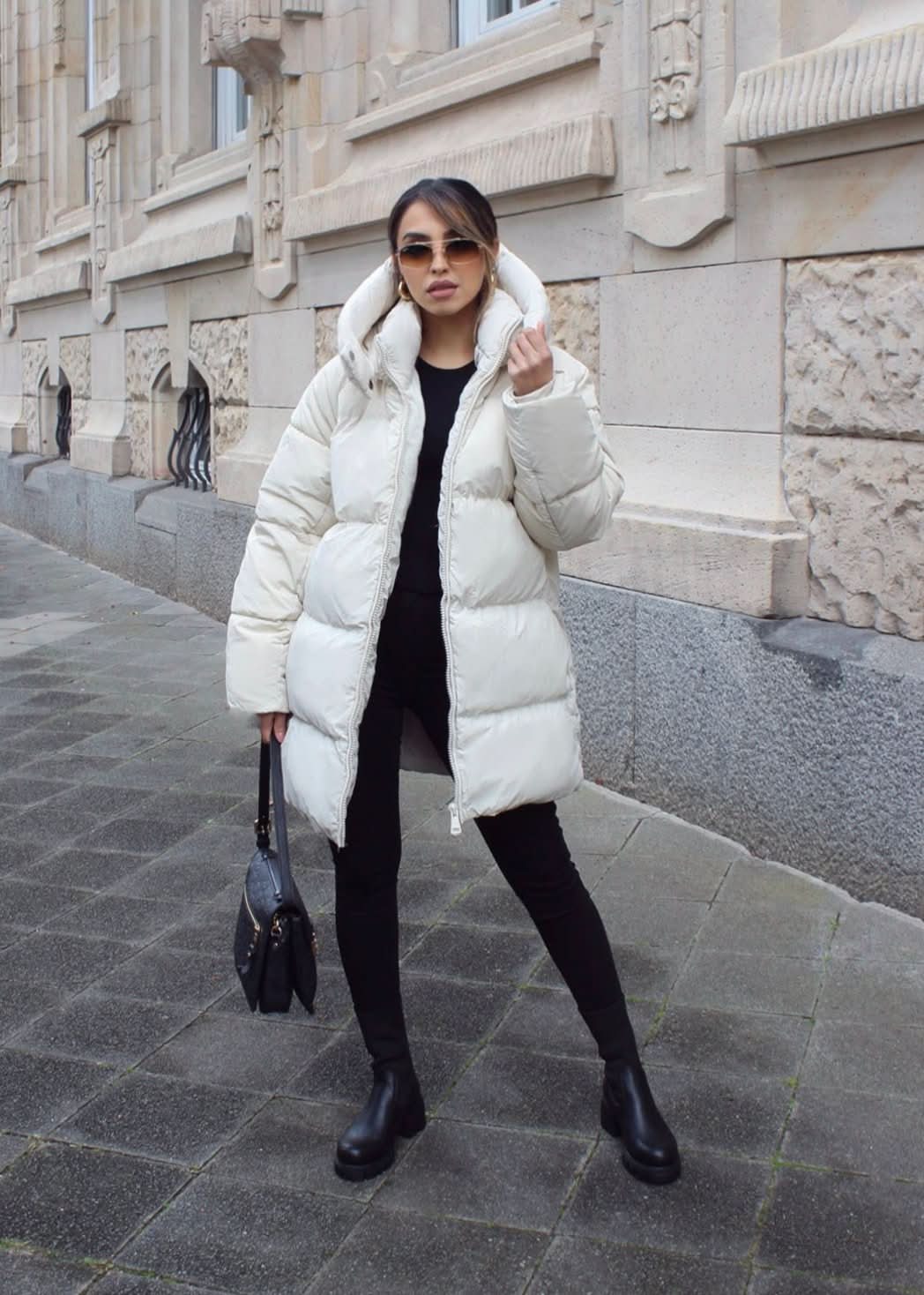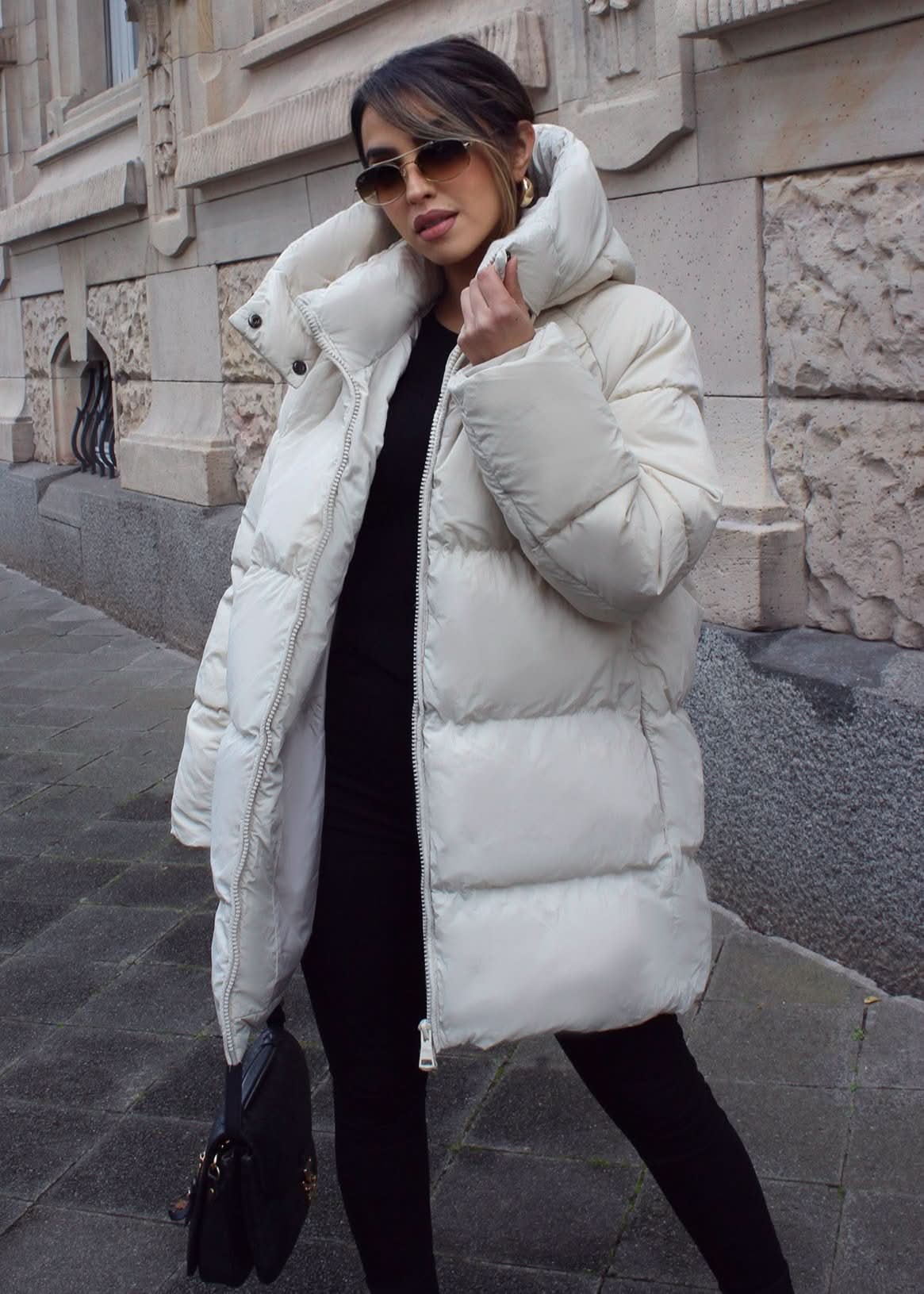 This lightweight, oversized winter jacket combines style with functionality! It features a high collar and a practical hood to keep you warm. The side pockets provide space for your essentials, while the double closure with zipper and snap buttons offers extra protection.