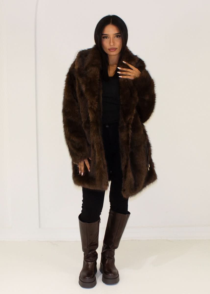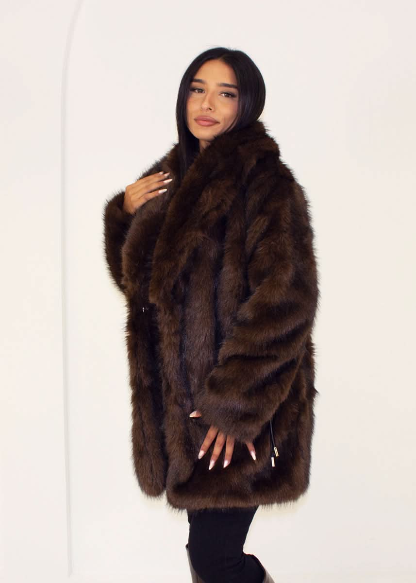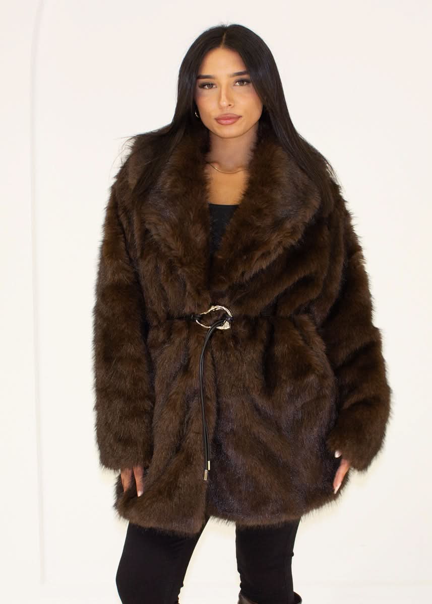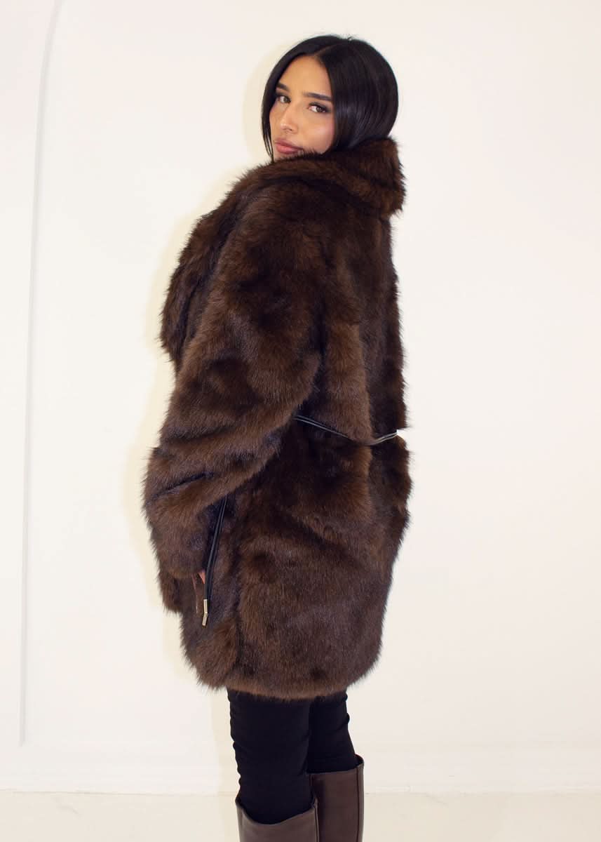 The luxurious faux fur coat by NAHA combines elegance with functionality. Soft faux fur ensures a warm wearing experience, while side pockets and discreet snap buttons offer practical details. The waist belt accentuates the figure, making the coat a versatile essential for stylish autumn and winter looks.
