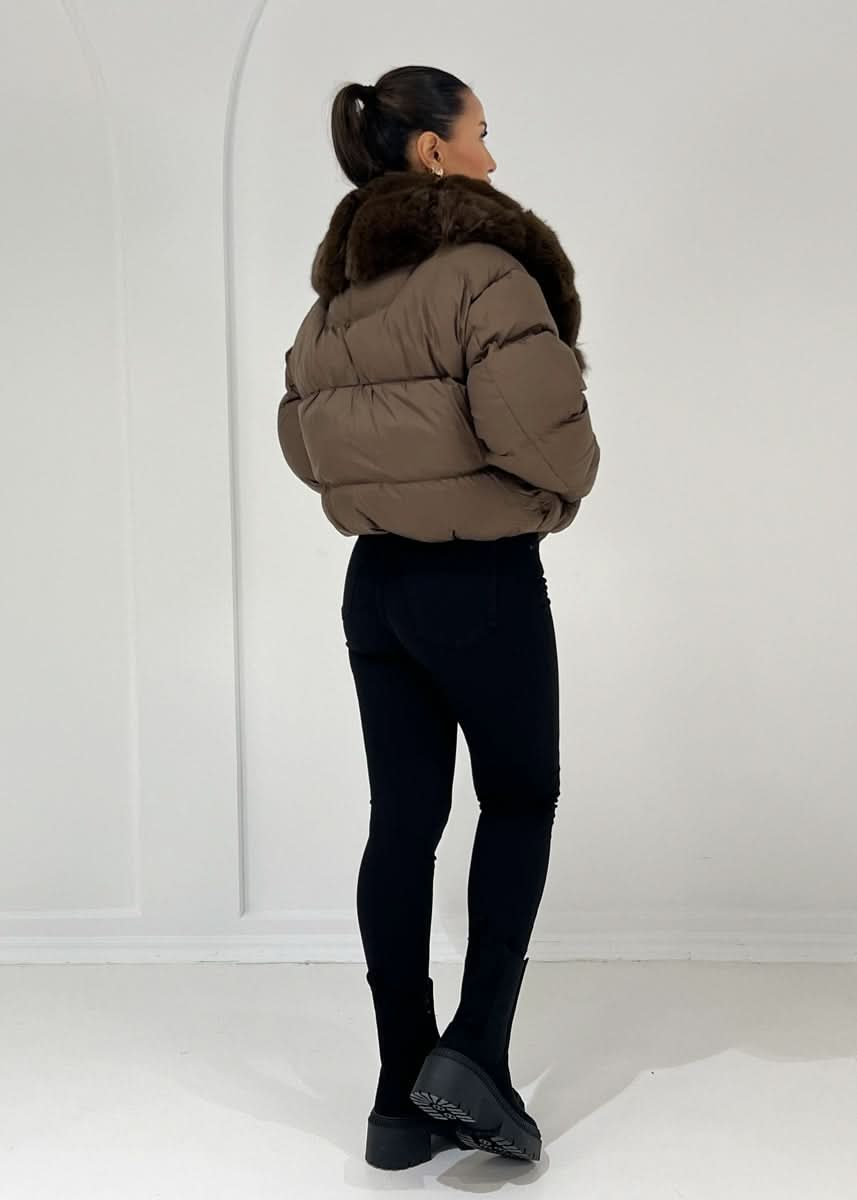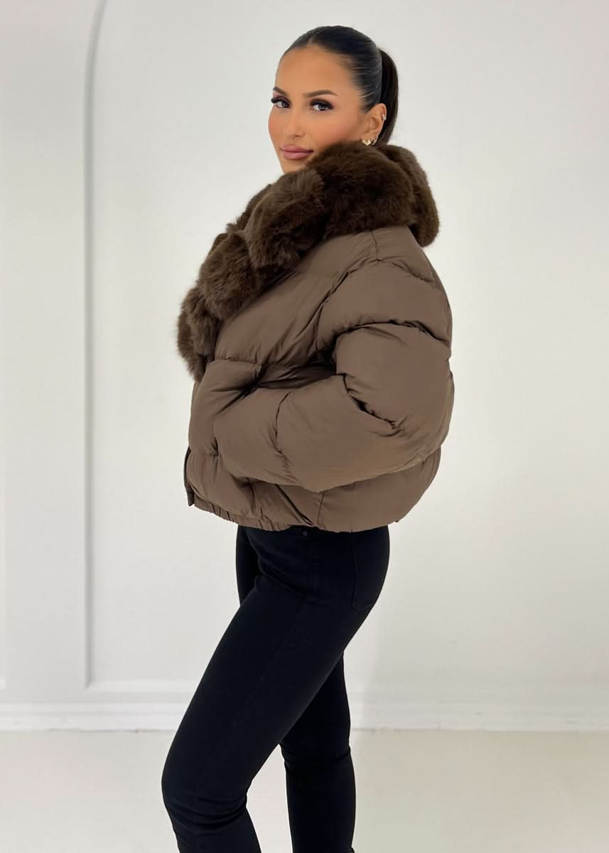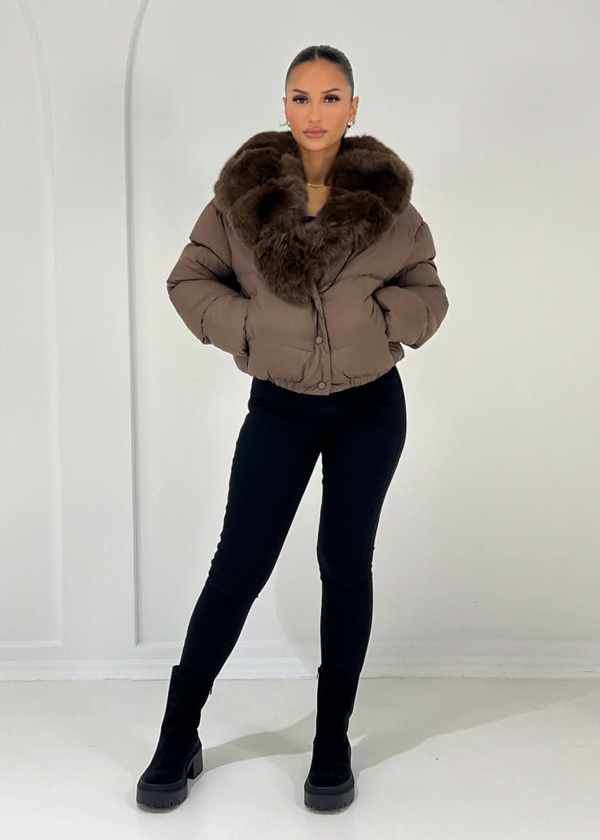 This short quilted jacket combines warmth and elegance. The voluminous faux fur collar adds a sophisticated look and extra comfort. The jacket fastens with snap buttons and features side pockets for practical details.