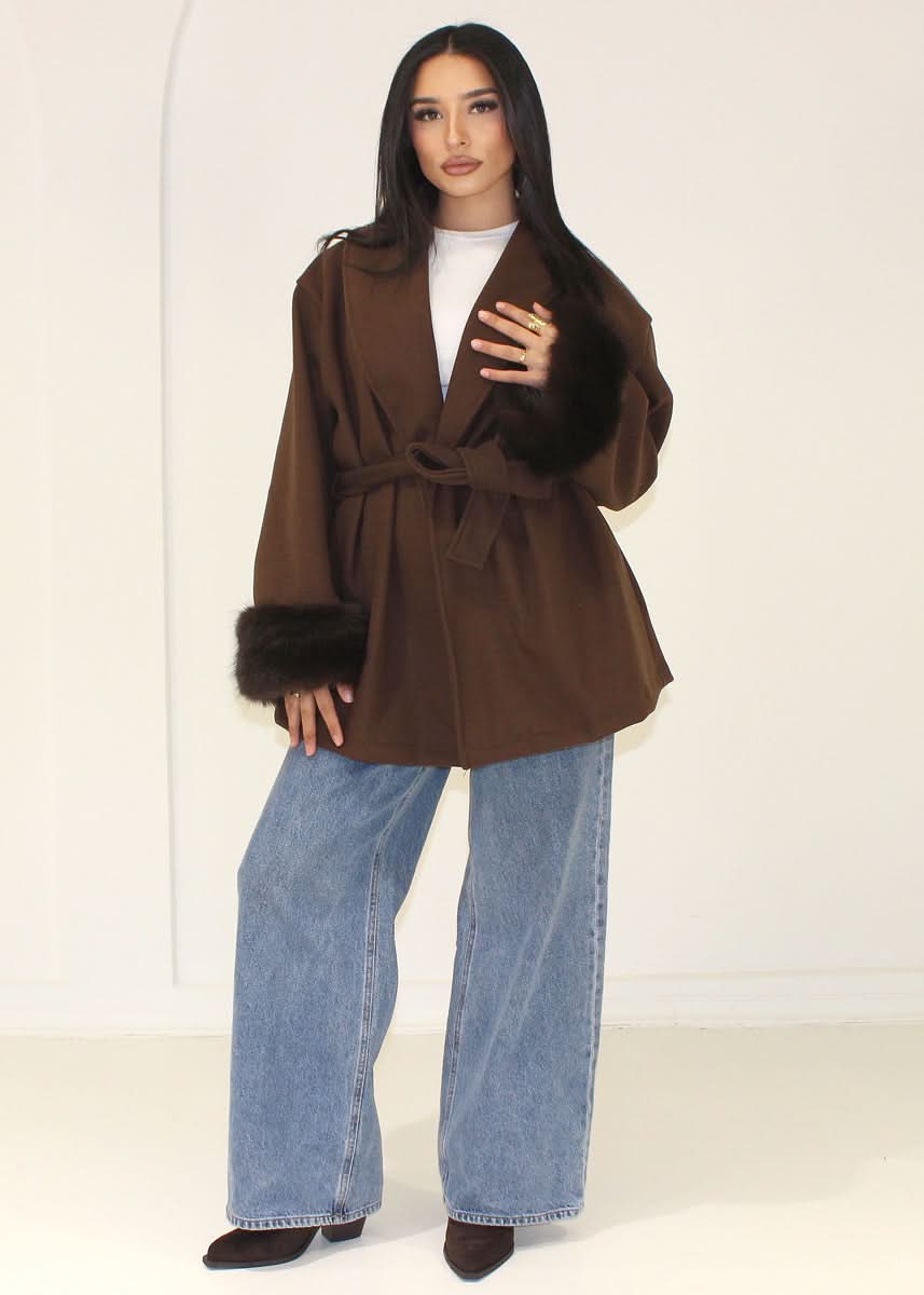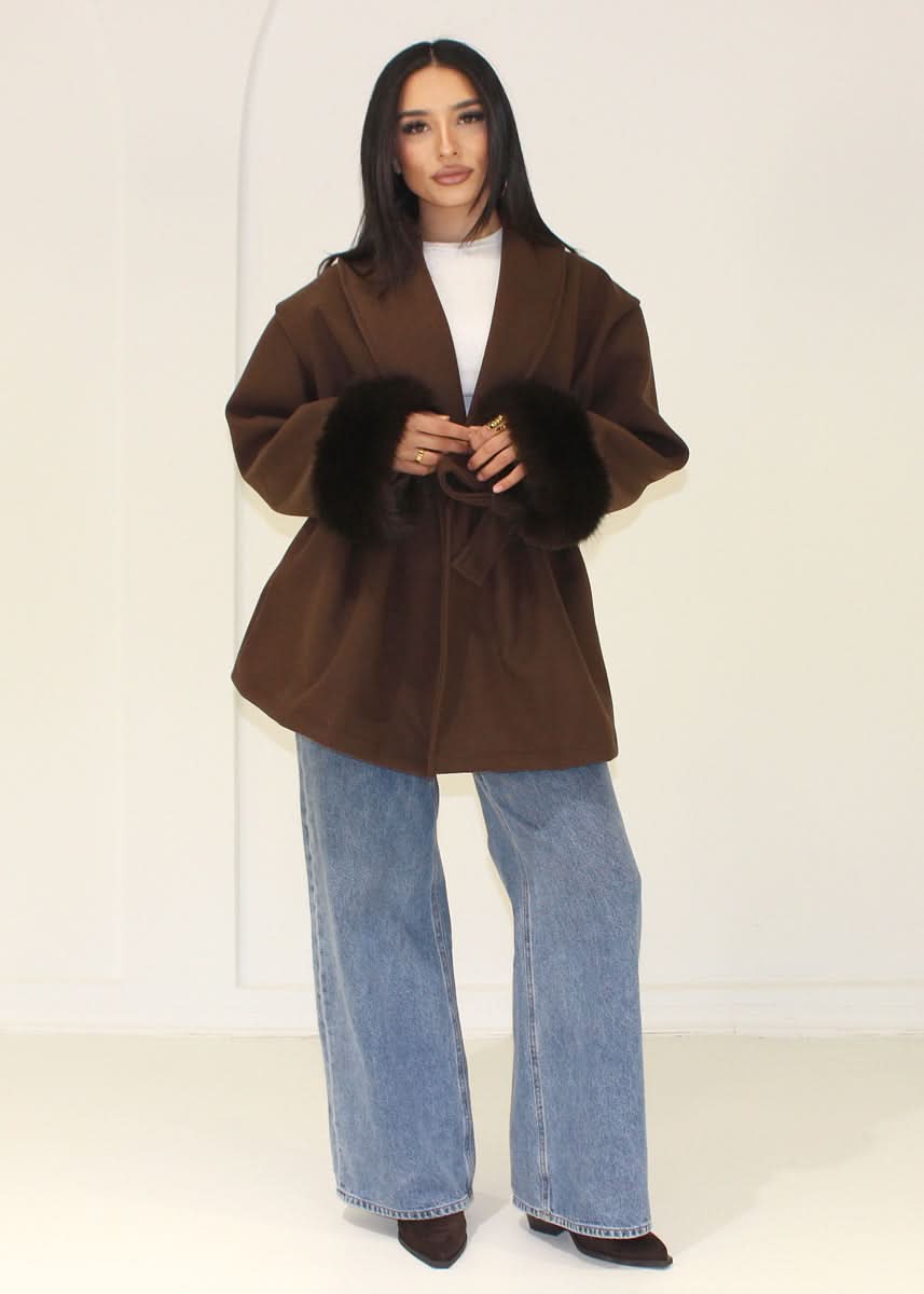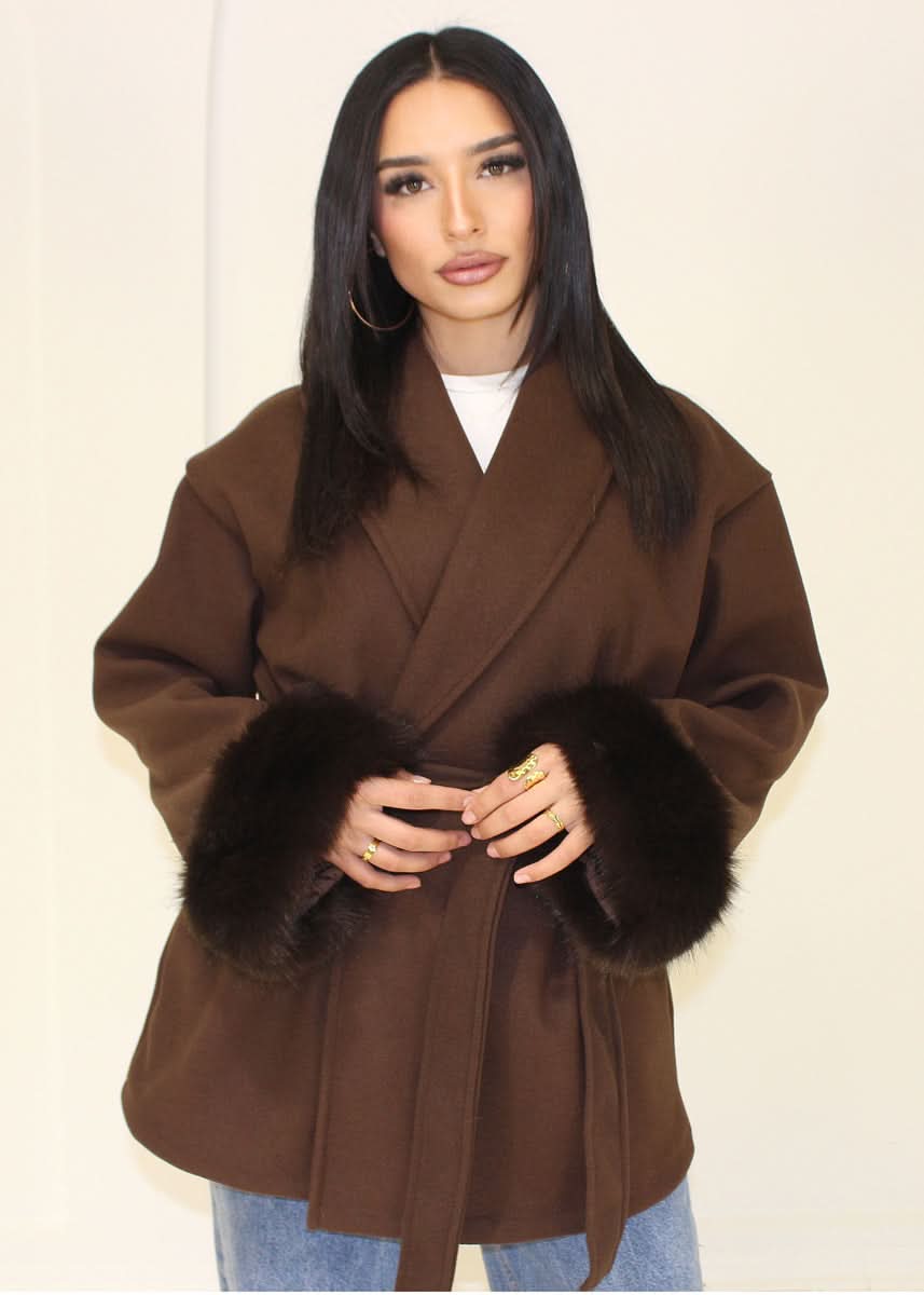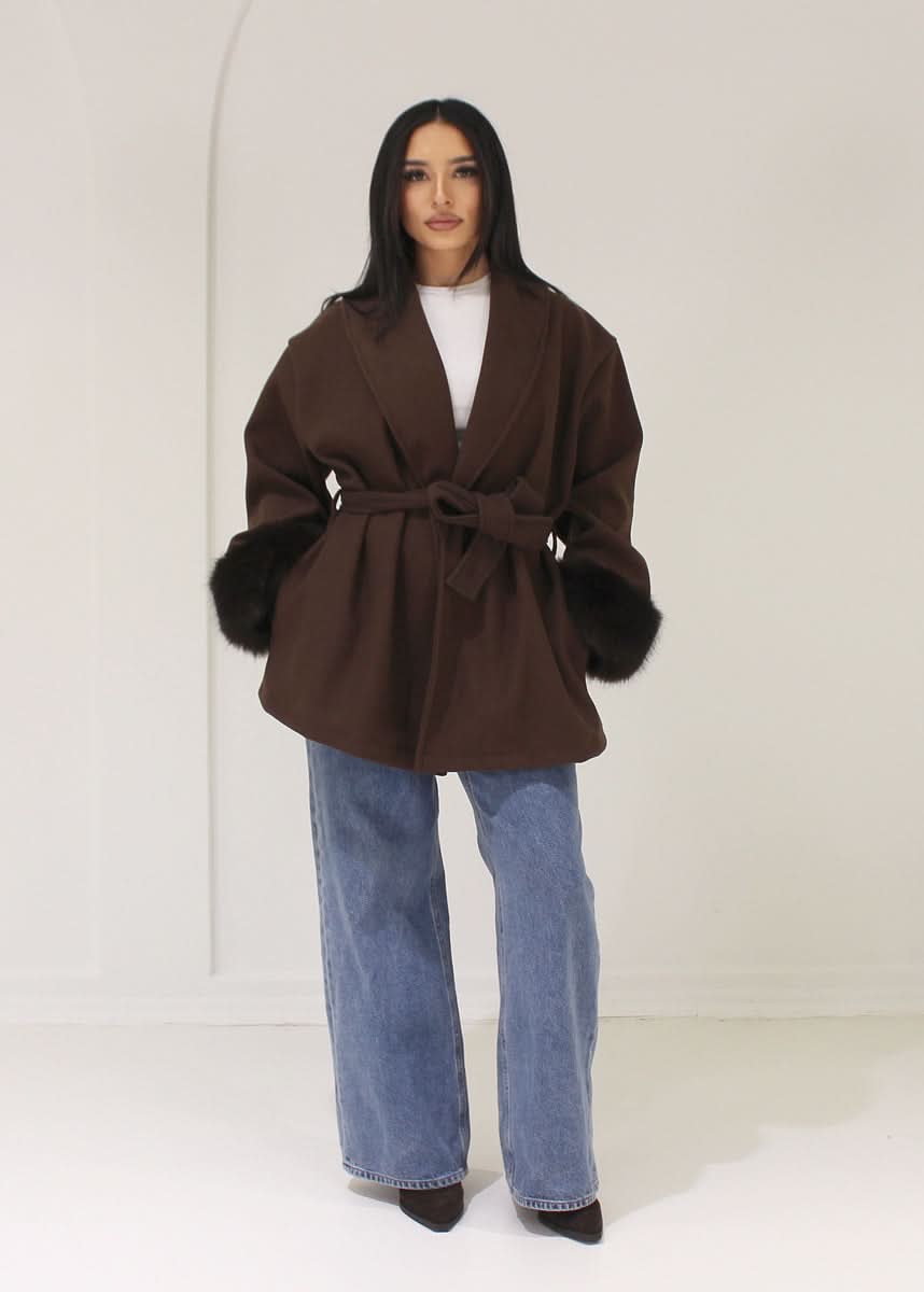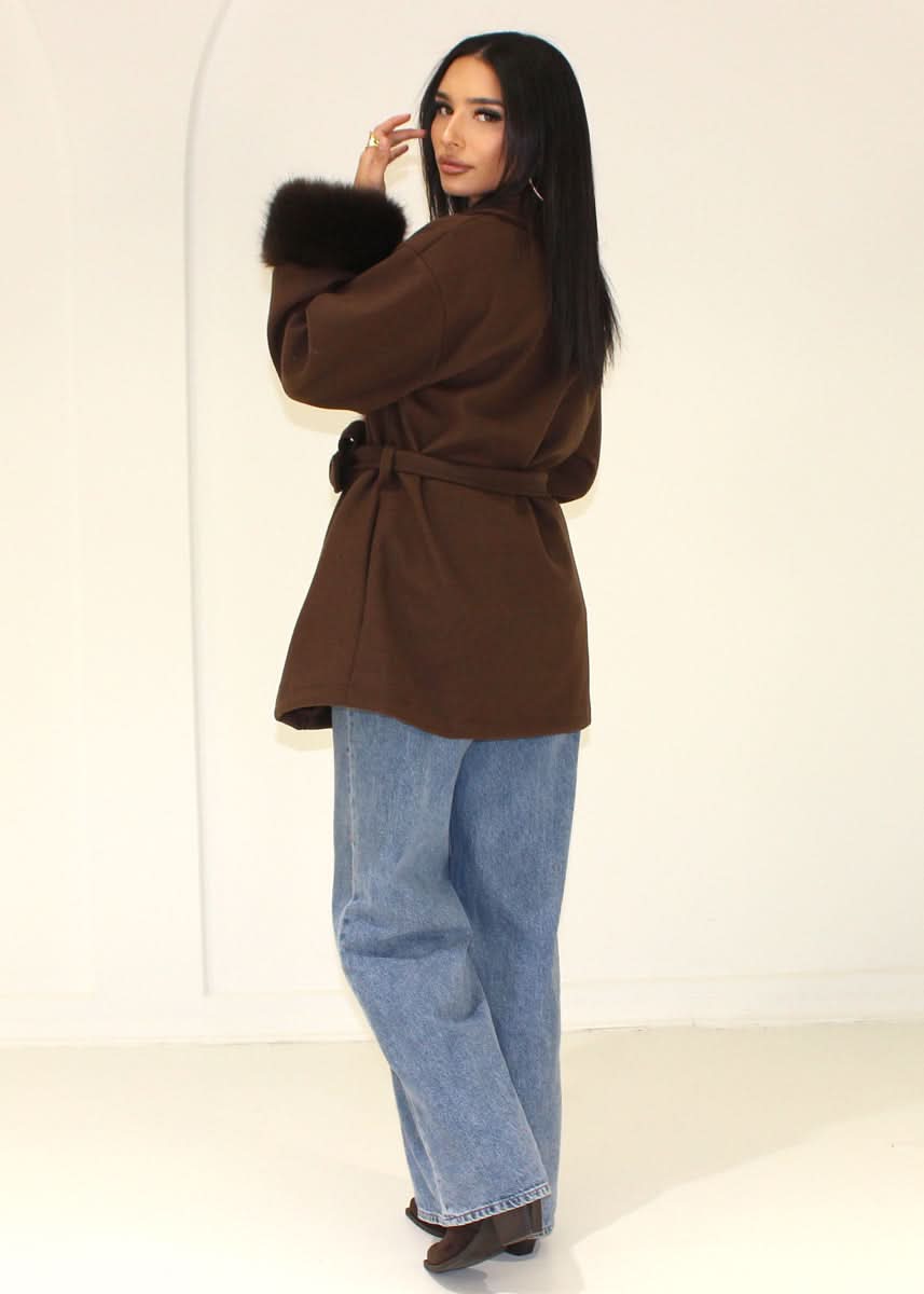 Elegant short coat with soft faux fur cuffs on the sleeves. Slightly fitted cut with a tie belt for personalized adjustment. Side slit pockets for everyday functionality. Wide lapels and a clean, structured drape.