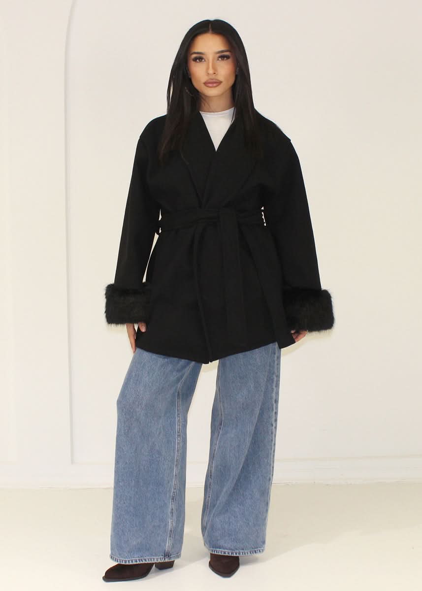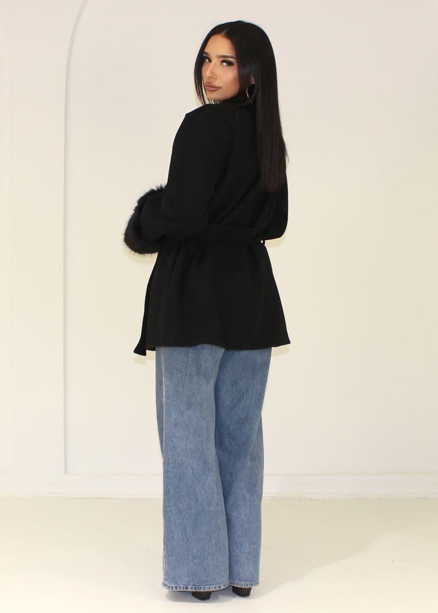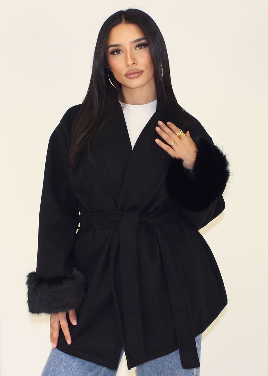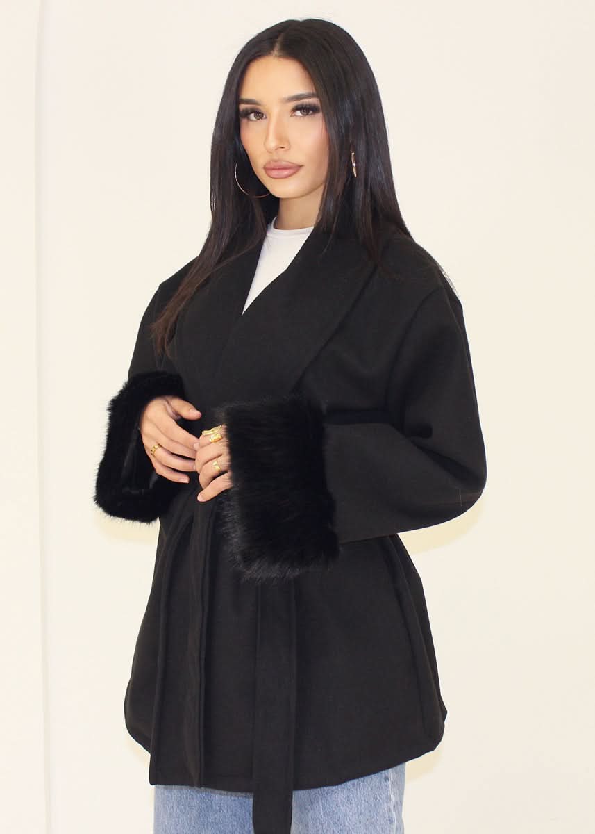 Elegant short coat with soft faux fur cuffs on the sleeves. Slightly fitted cut with a tie belt for individual adjustment. Side slit pockets for everyday functionality. Wide lapels and a clean, structured drape.