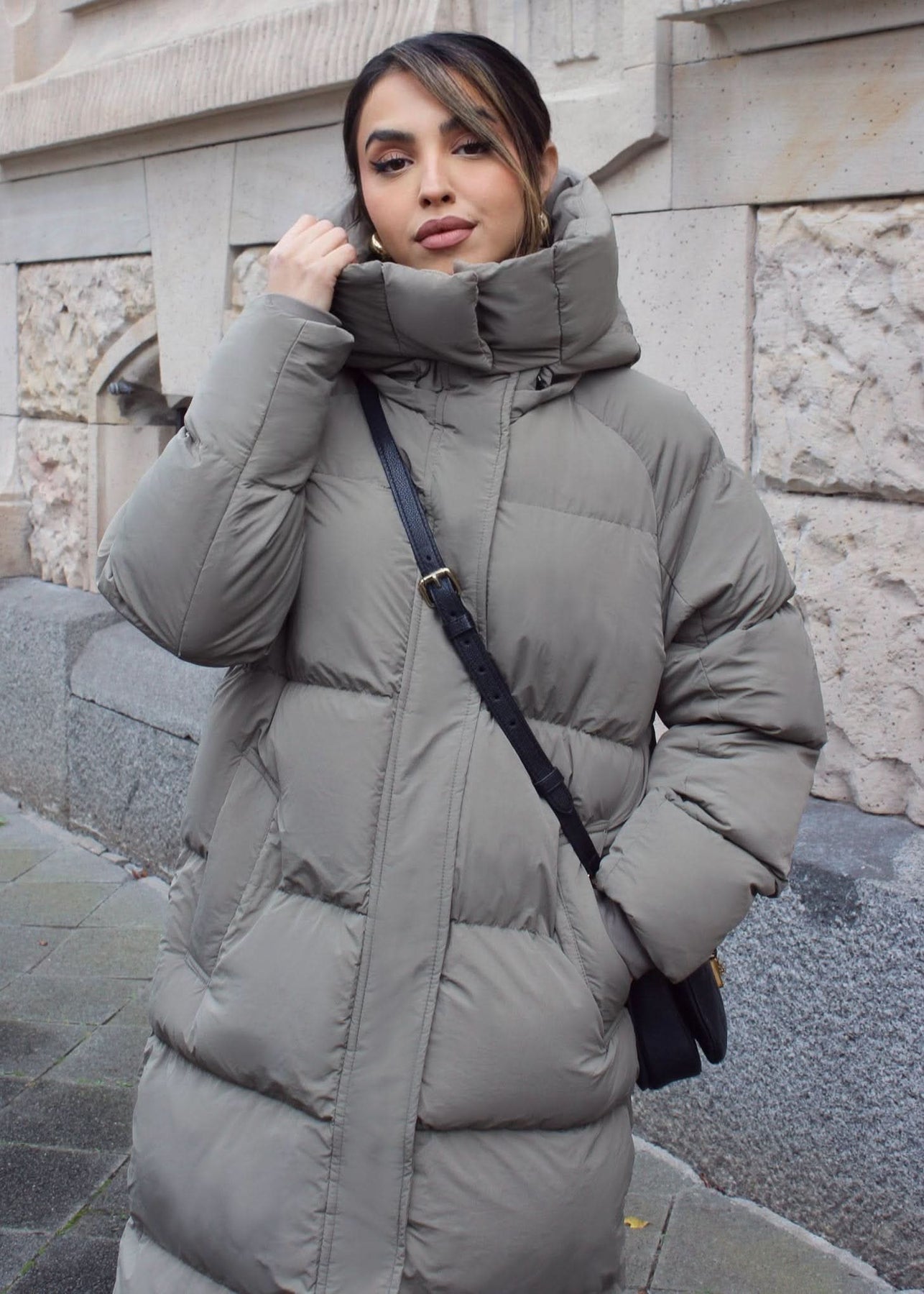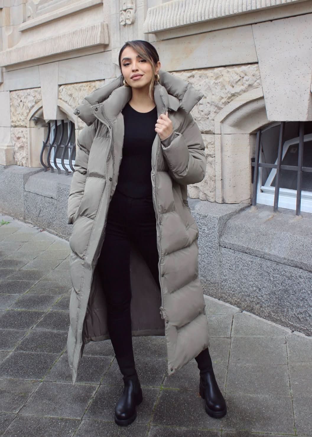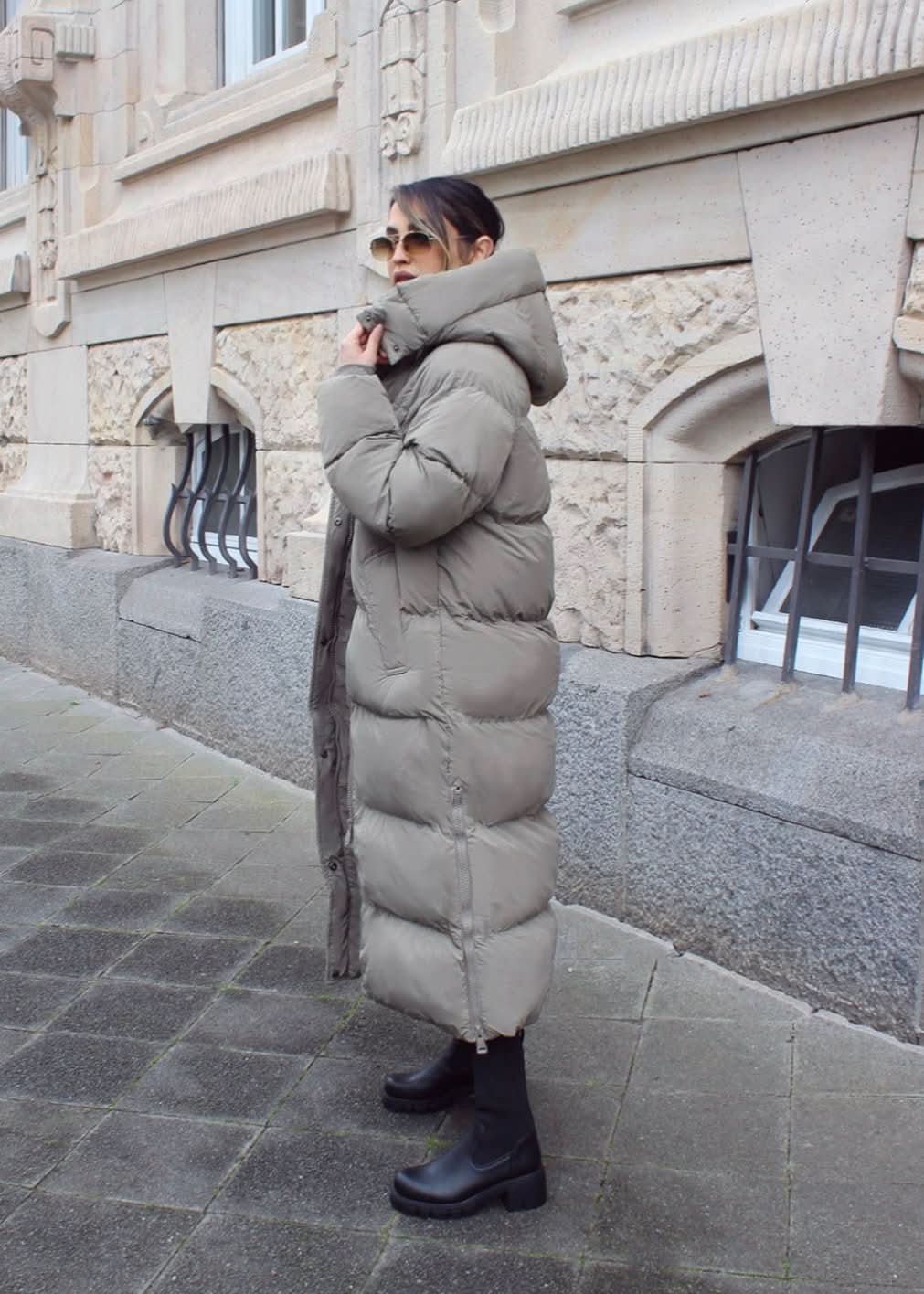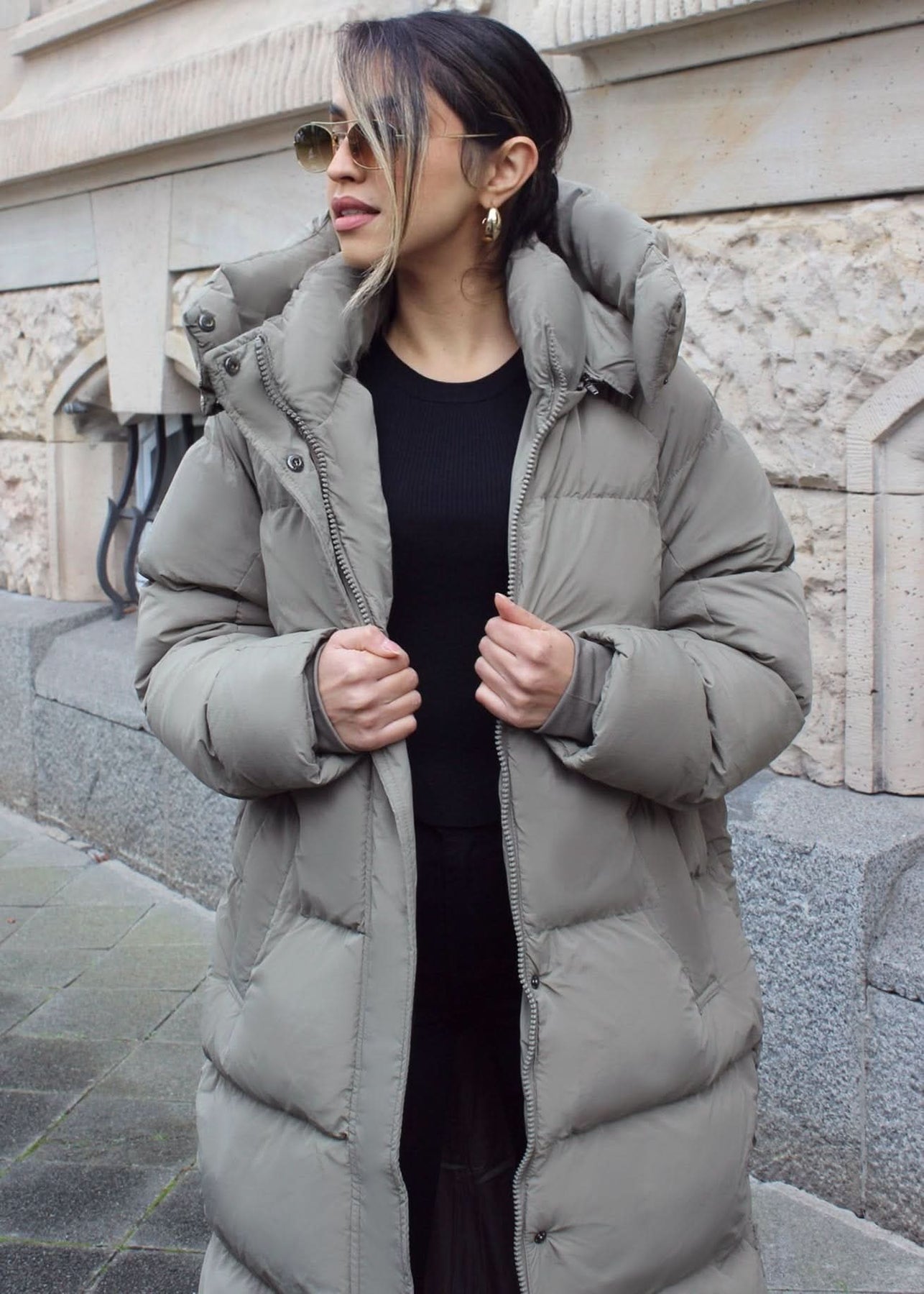This long oversized winter jacket combines style with functionality! It features a high collar and a practical hood to keep you warm. The side pockets offer space for your essentials, while the double closure with zipper and snap buttons provides extra protection.