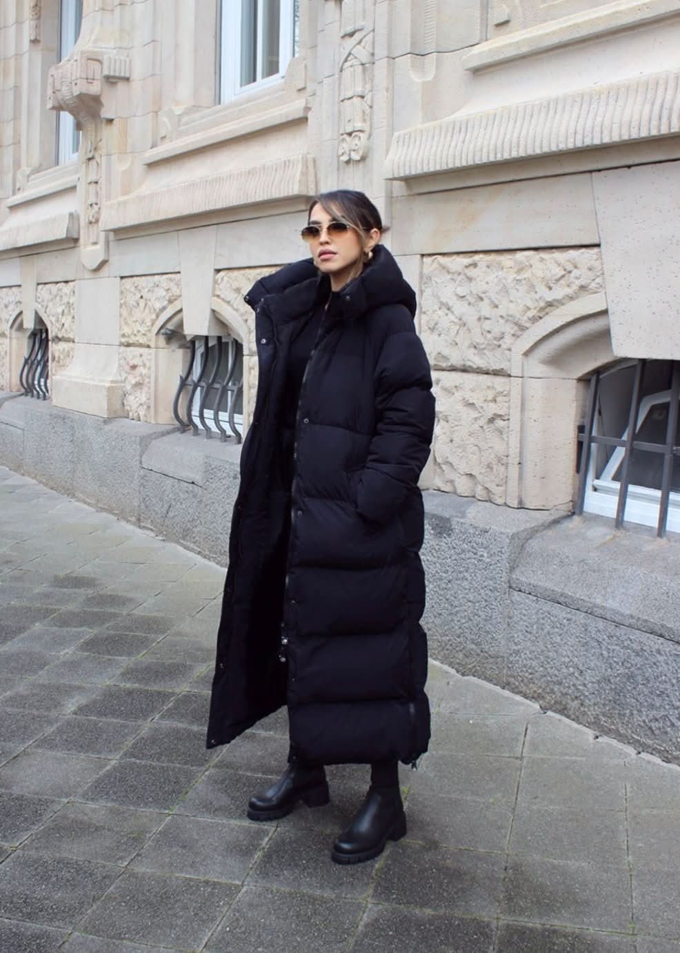 This long, oversized winter jacket combines style with function! It features a high collar and a practical hood to keep you warm. The side pockets provide space for your essentials, while the double closure with a zipper and snap buttons offers extra protection.