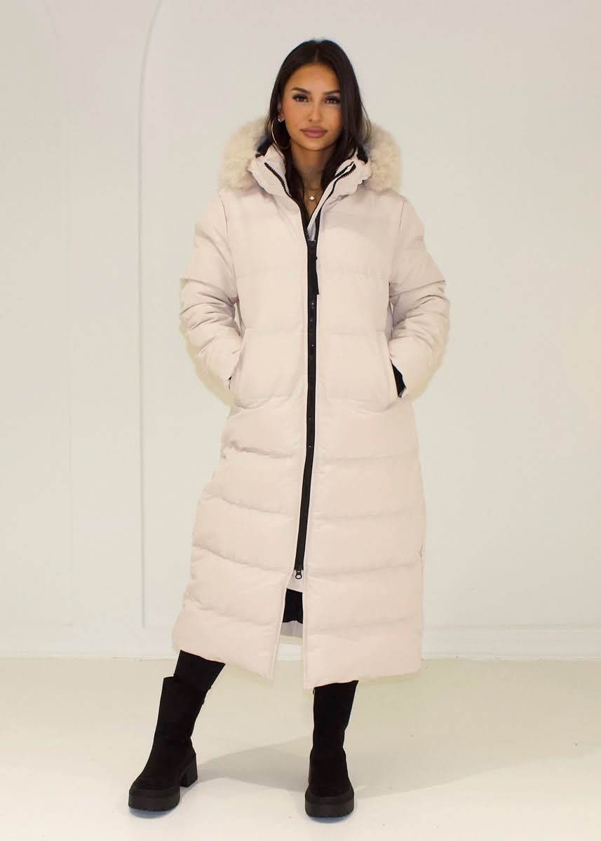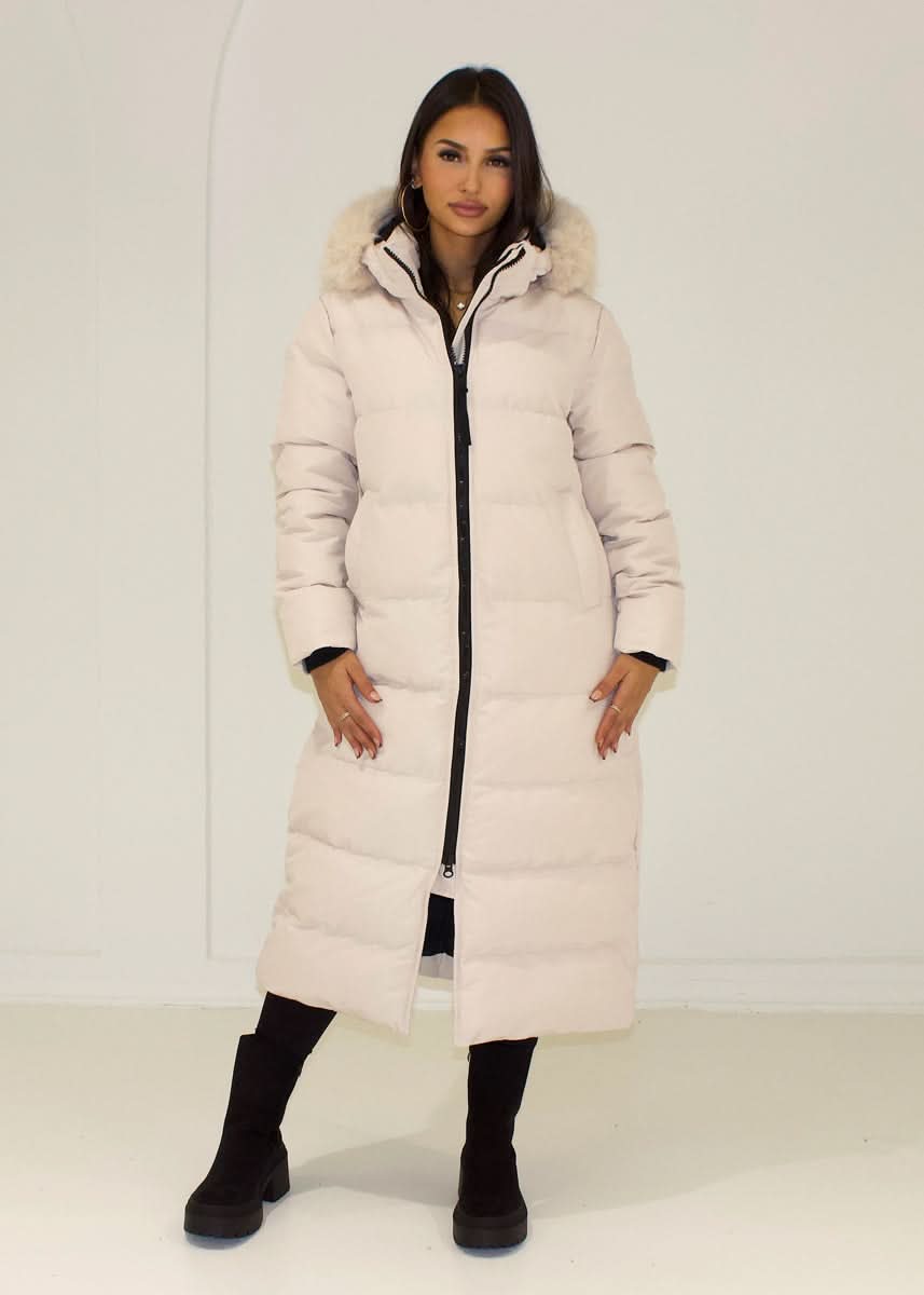 Warm, long winter parka with a full-length zipper and a hood featuring a cozy faux fur trim.