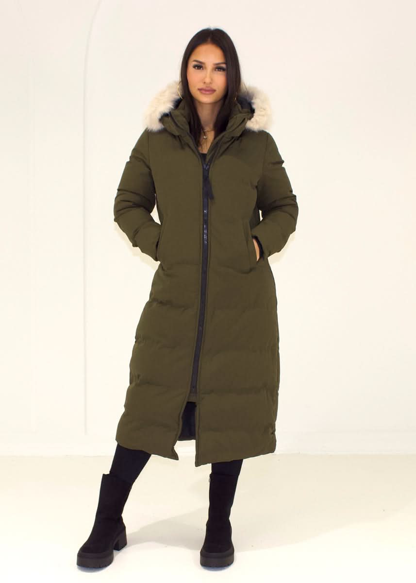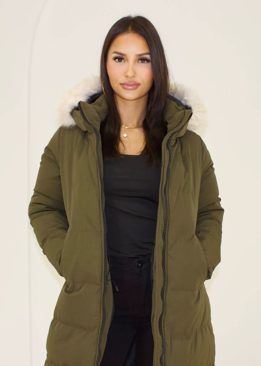 Warm, long winter parka with a full-length zipper and a hood featuring a cozy faux fur trim.