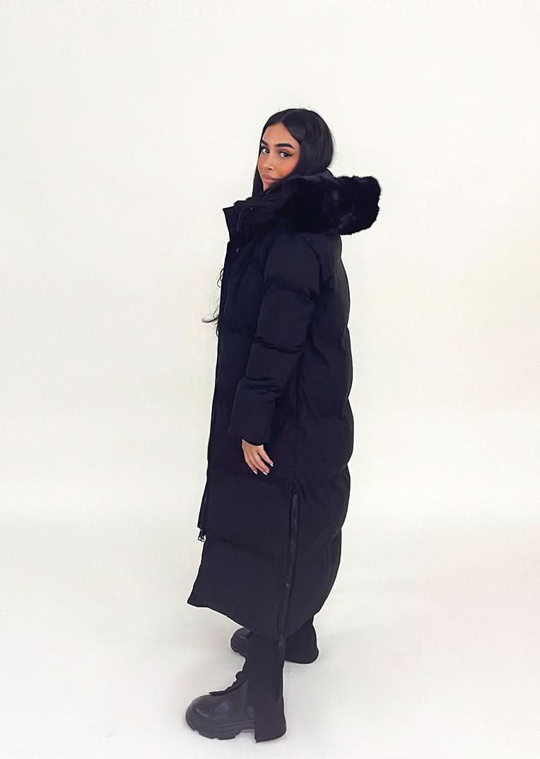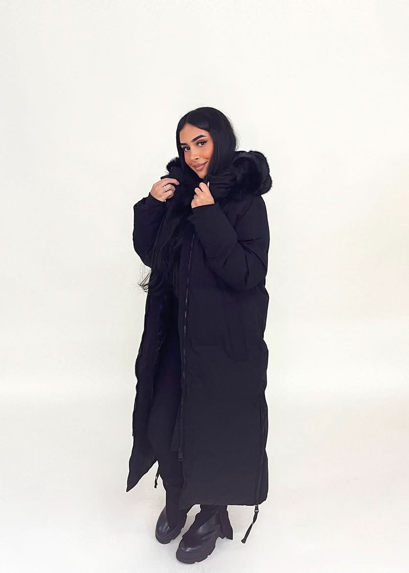 This long quilted coat is the ideal companion for cold days. The generously sized hood protects against wind and weather, while the side zippers provide greater freedom of movement and a modern look. The coat is warmly lined, comfortably tailored, and features practical side pockets.