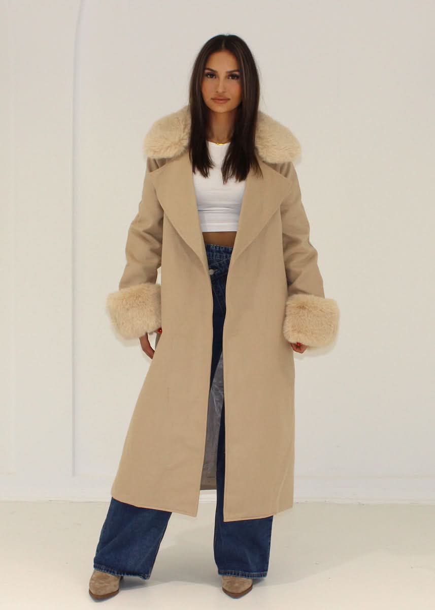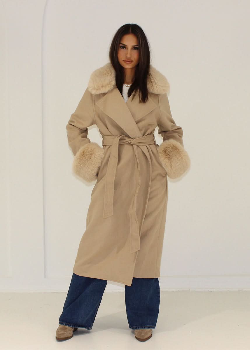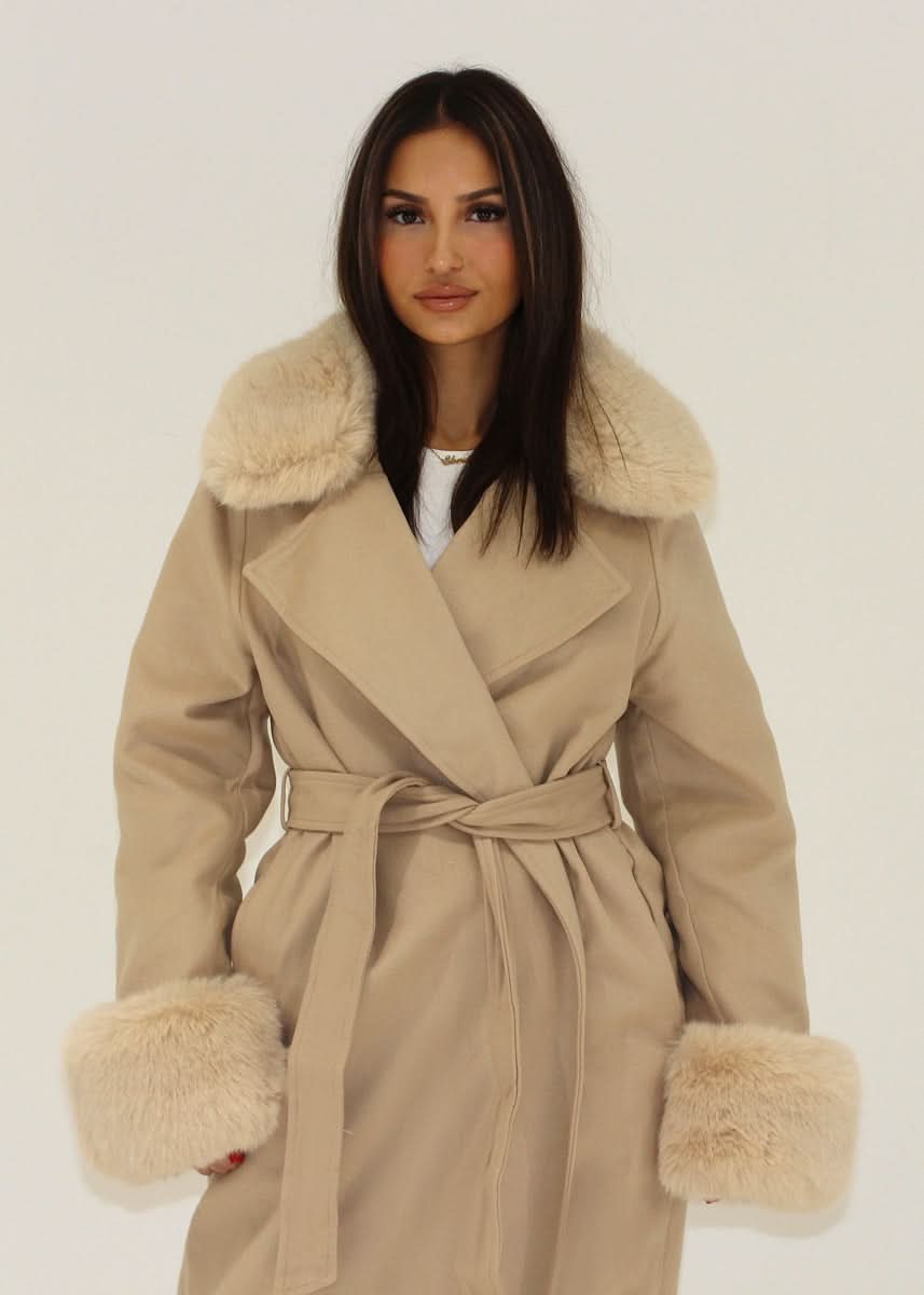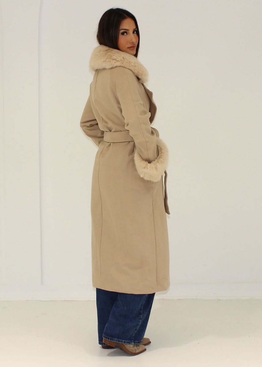 Elegant coat with a soft, removable faux fur collar and matching faux fur cuffs.