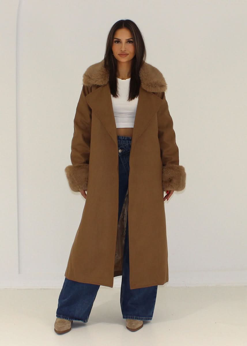 Elegant coat with soft, detachable faux fur collar and matching faux fur cuffs.