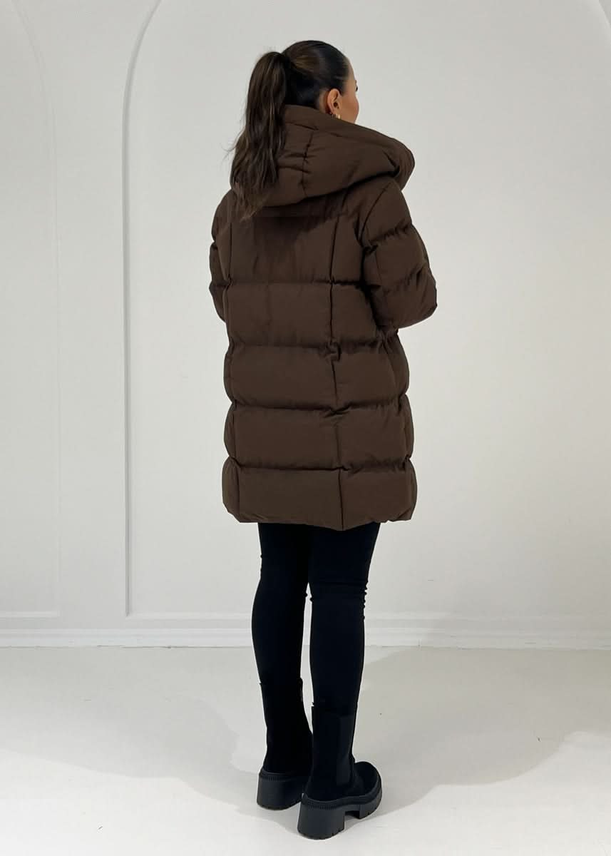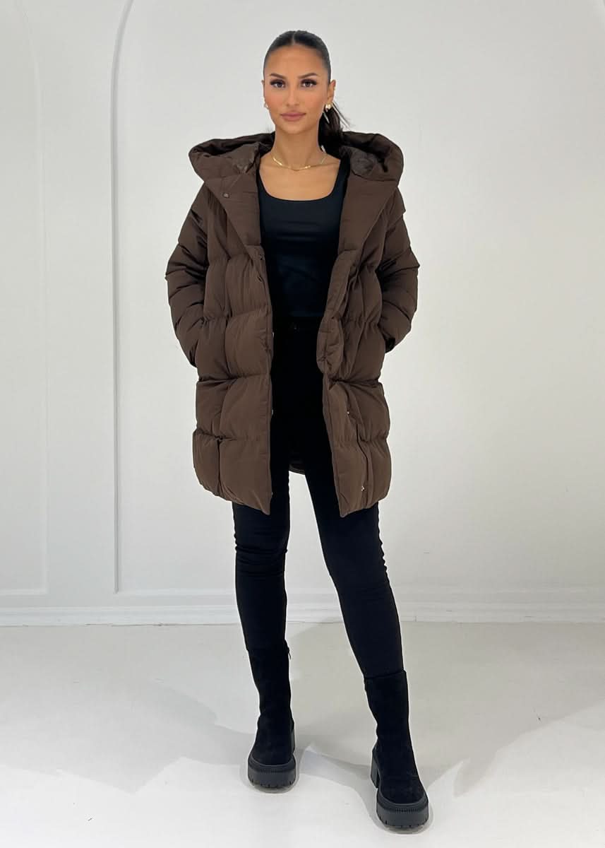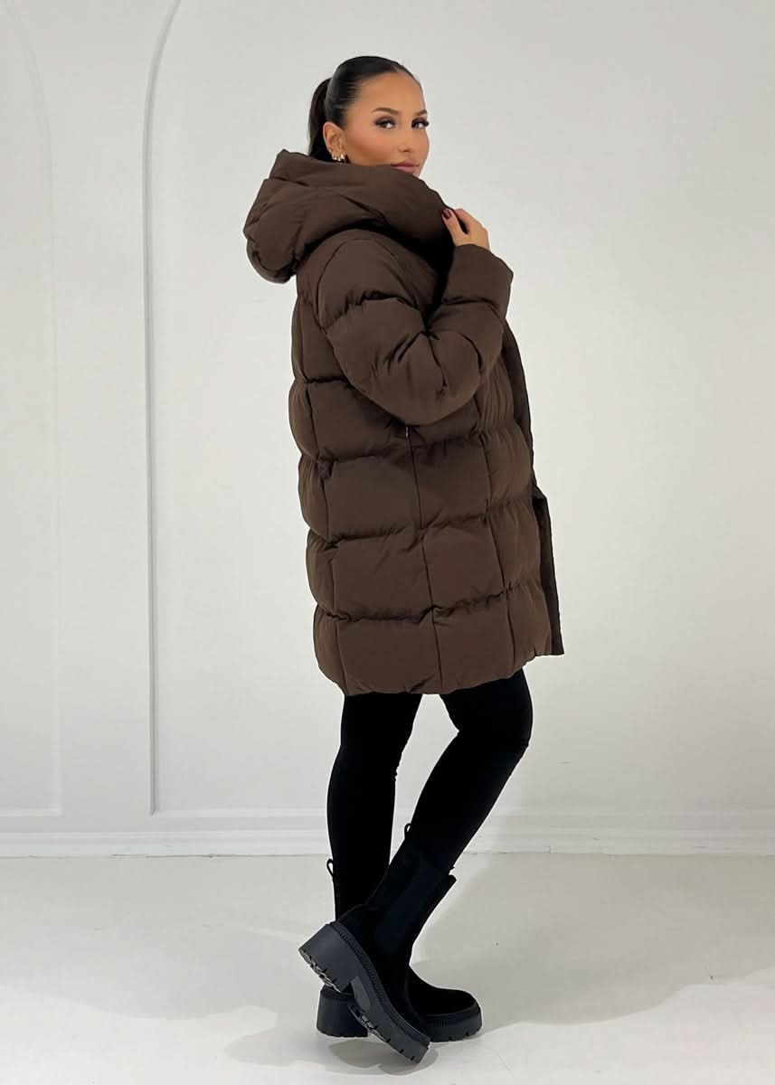 The mid-length quilted jacket offers both warmth and style. It is equipped with a hood, features practical side pockets, and fastens with snap buttons. The additional tie belt accentuates the waist and creates a feminine silhouette.