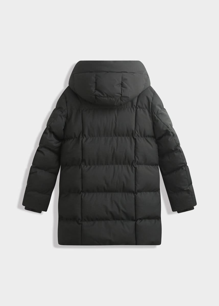 The mid-length quilted jacket offers both warmth and style. It features a hood, practical side pockets, and closes with snap buttons. The additional tie belt accentuates the waist and creates a feminine silhouette.