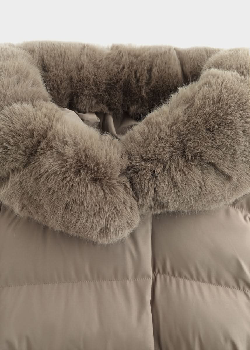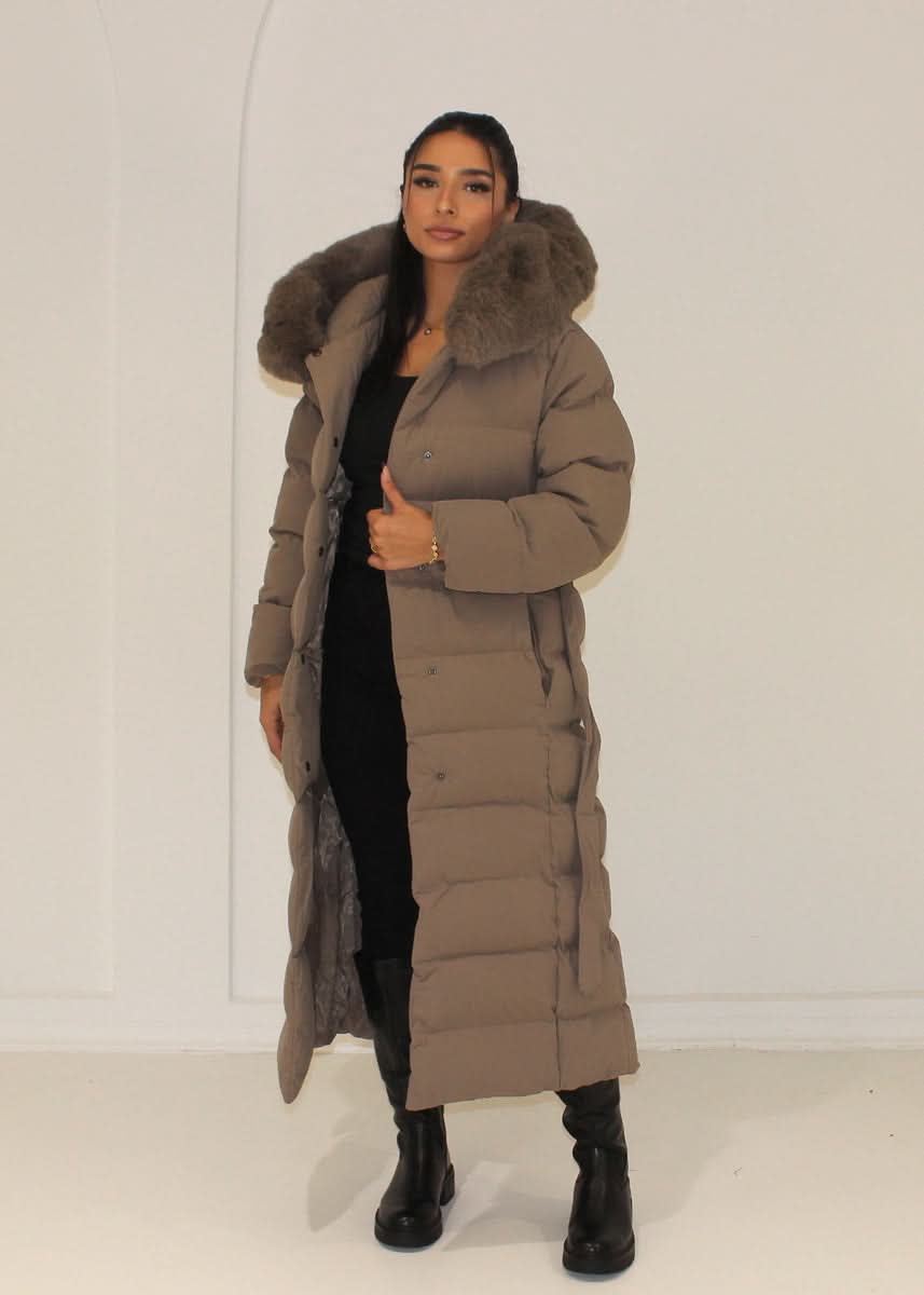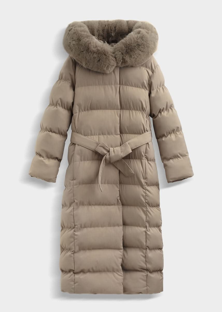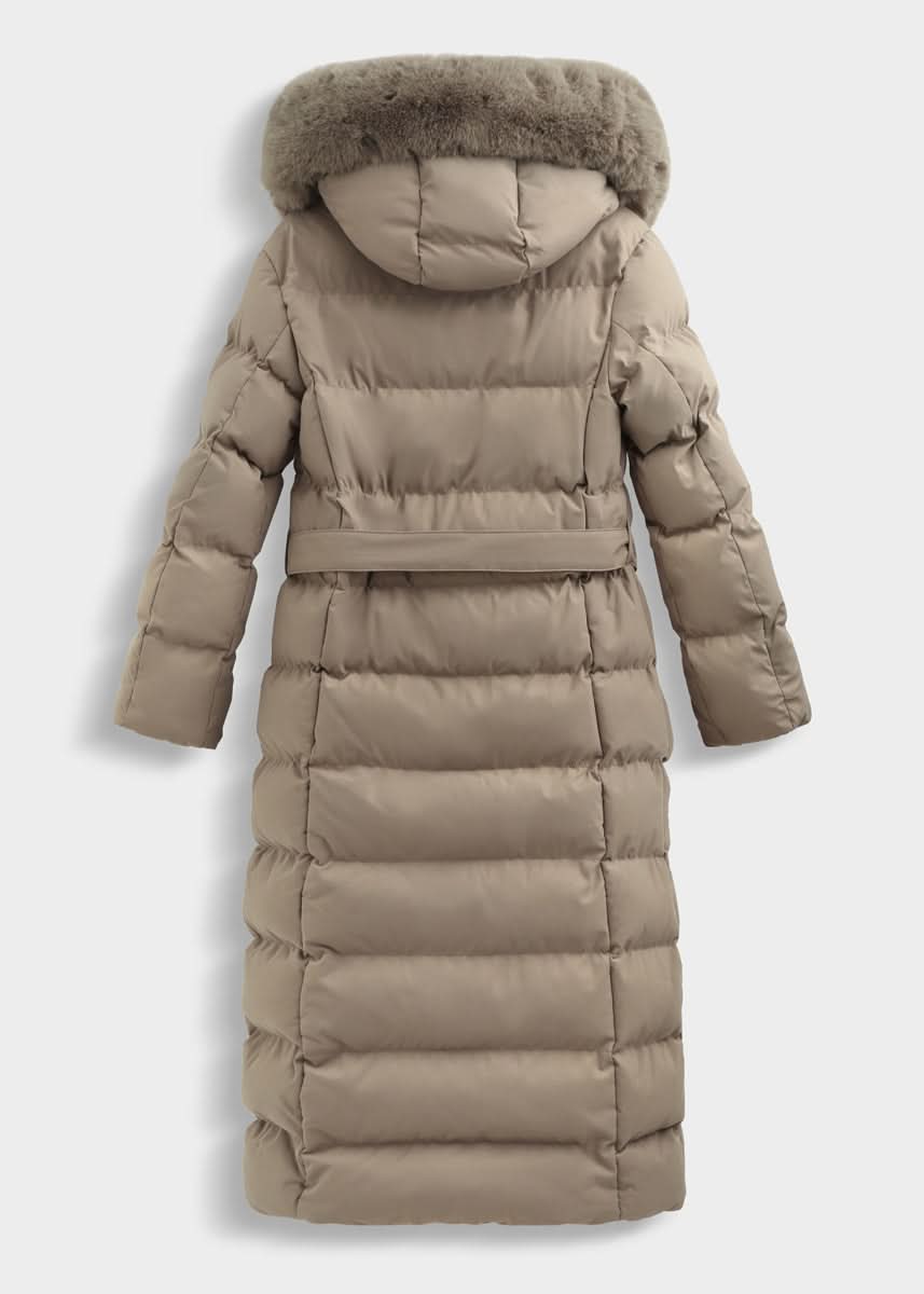 A coat that not only keeps you warm but also impresses with its elegant silhouette. The long quilted coat with hood is perfect for cold days—both functional and stylish. The belted waist creates a feminine fit, while the soft padding ensures comfortable wear. Snap button closure.