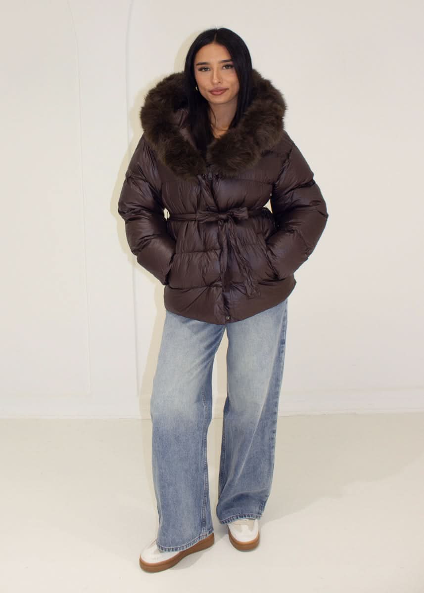 Quilted jacket with hood and tie belt