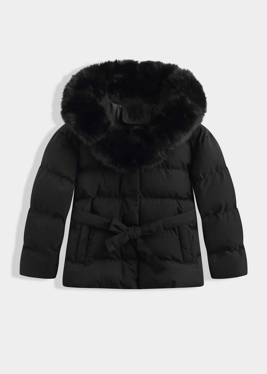 The short quilted jacket impresses with its elegant faux fur collar and a waist belt that ensures a feminine fit. Practical side pockets and a concealed button placket complete the design.