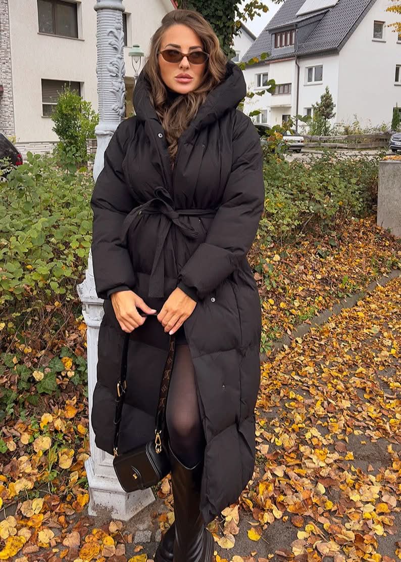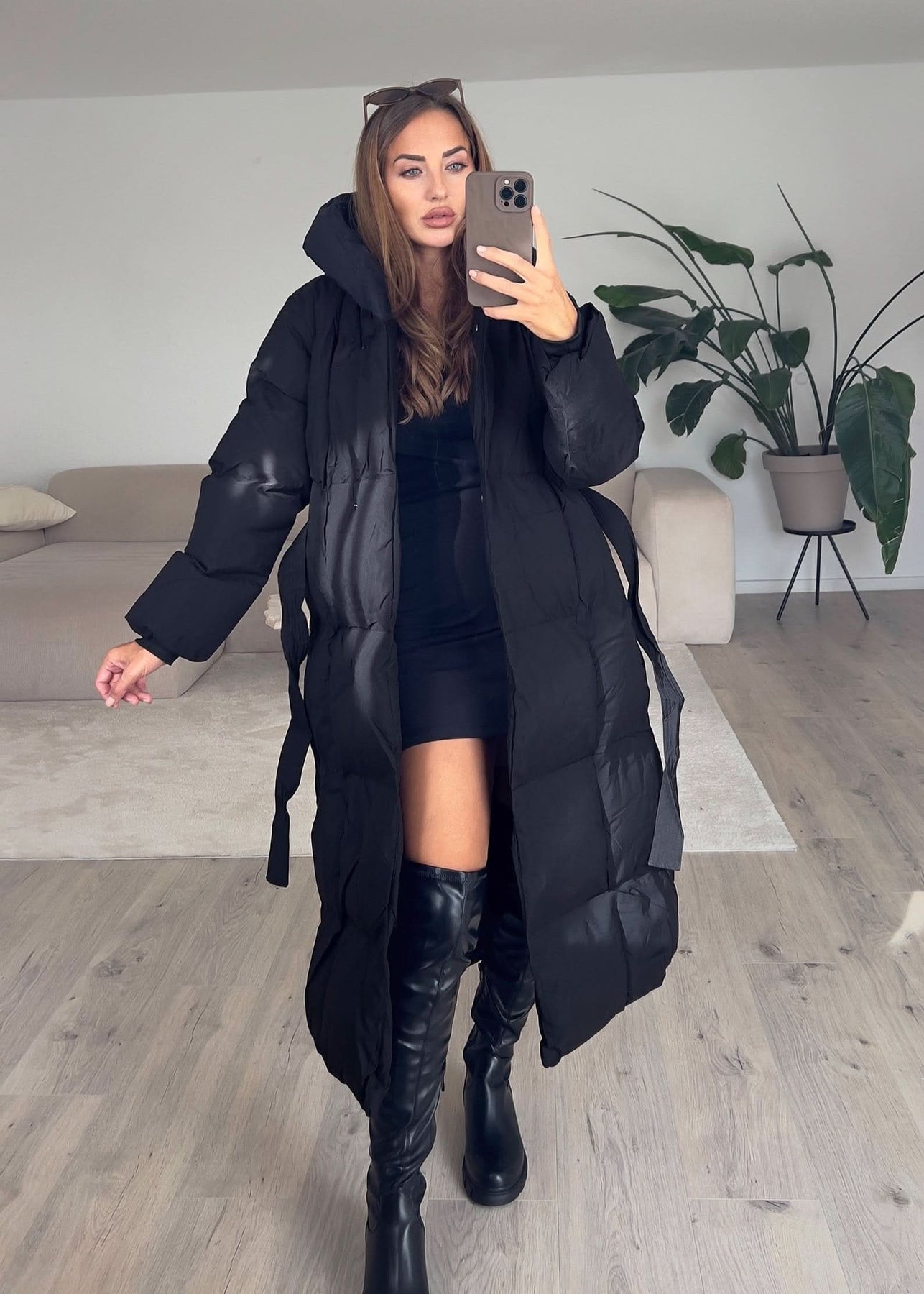 This long winter jacket combines functionality and style. The integrated hood provides protection against wind and weather, while the belt accentuates the waist and creates a feminine silhouette. The snap button closure makes it easy to put on and take off and reliably keeps you warm. Two side pockets offer space for small essentials and keep your hands warm on cold days.